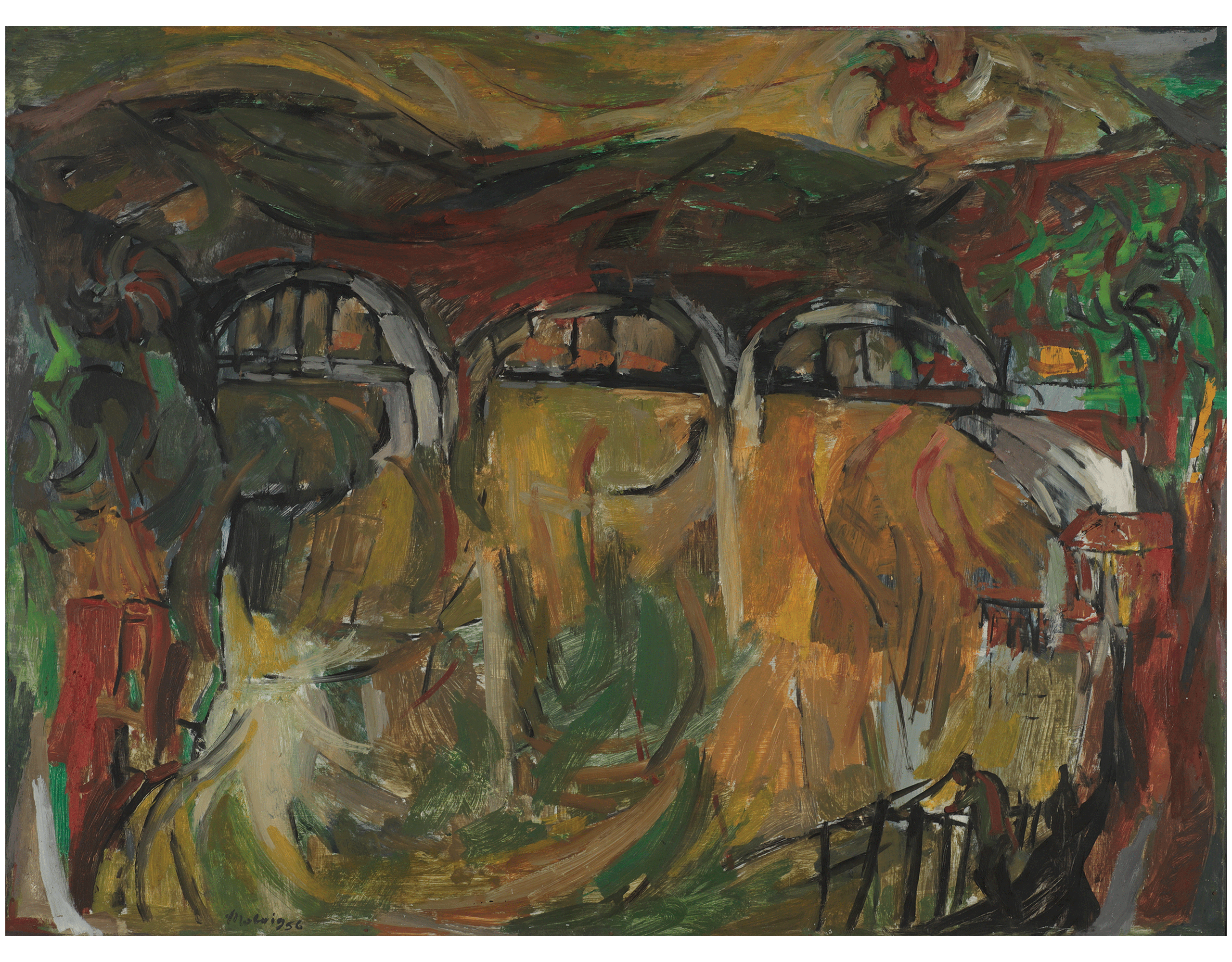 Opened in 1932, it has remained a common subject for painters who have interpreted it in very different styles, from Hubert Jarvis’ light, neat watercolour rendering in View of Brisbane from Coronation Drive (1946) to Jon Molvig’s dark and abstracted Grey St Arrangement (1956). We don’t know for certain why so many artists have been drawn to paint this bridge, but it is likely the appeal of its repeated Art Deco arches that create a rounded reflection in the river below.