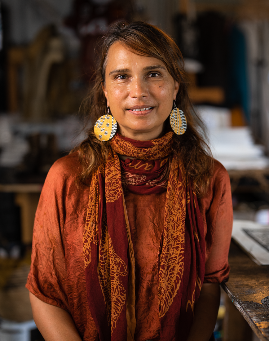 Quandamoooka artist, Delvene Cockatoo-Collins is of the Nunukul and Goenpul (Minjerribah/North Stradbroke Island) and Ngugi of Mulgumpin (Moreton Island) – the people of the sand and sea. Her practice is founded in her rich connection to country, culture and community. Her work is a culmination of stories, culture, heritage and techniques passed down by intergenerational transmission, notably through her mother Evelyn Parken, and her grandmother Bethel Delany. Delvene is known for her contemporary textiles, expressing her family’s experiences on Minjerribah – where she lives and works. Her conceptual wearables apply traditional, sustainable mat-making materials and techniques, and the use of clays and pigments found across Quandamooka including the islands and mainland around Moreton Bay. Her ethos of caring for Country is transferred through the beautiful patination she consistently achieves.